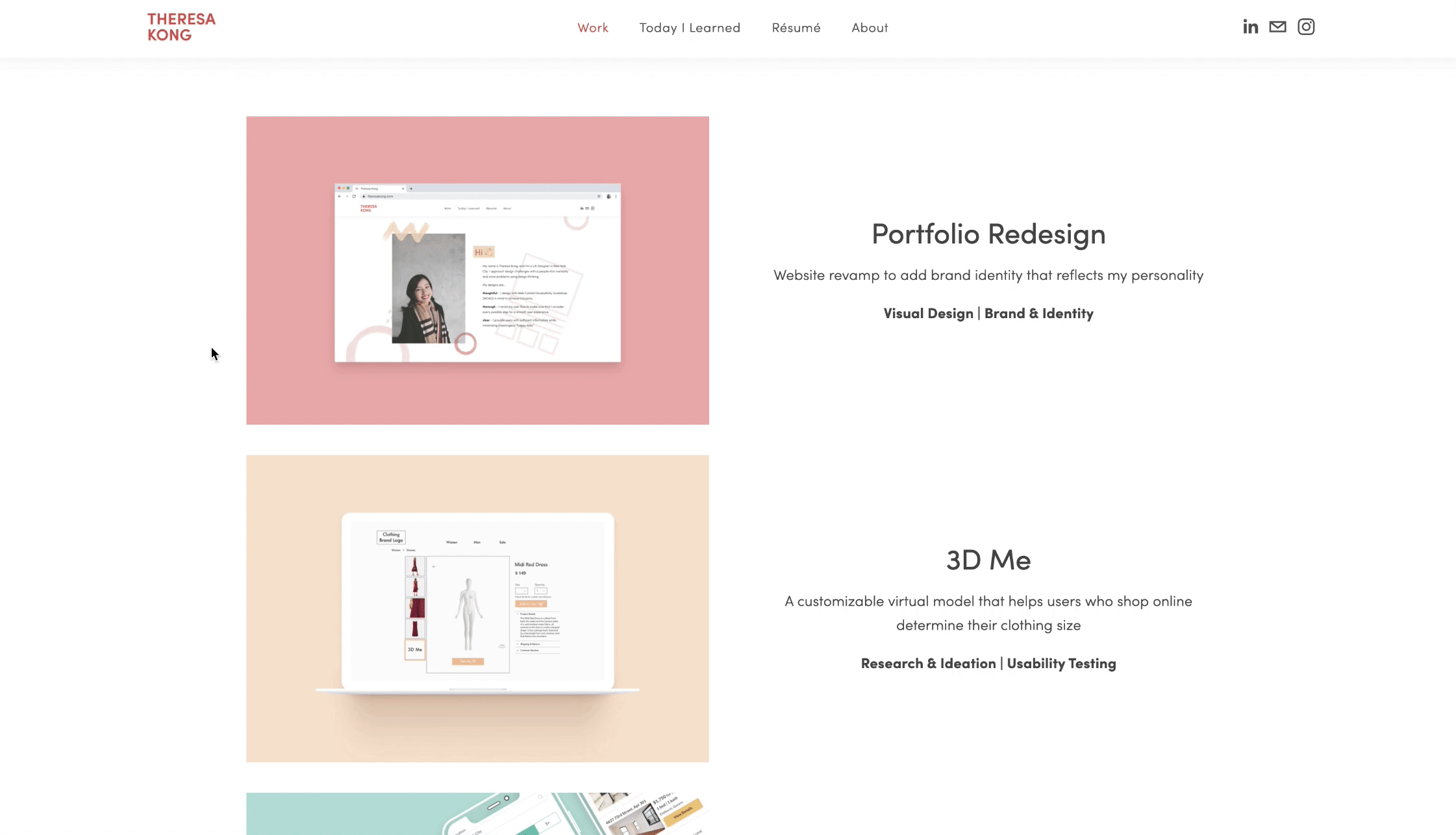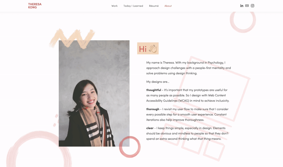 Visitors can now skim through content with bolded or large texts. Parallax scrolling also adds another layer of effect that makes people notice the intentional scrolling animation. For example, the “Outside of design” section slowly appears as visitors scroll down, making them notice that it is a transitional point that introduces my other fun facts.